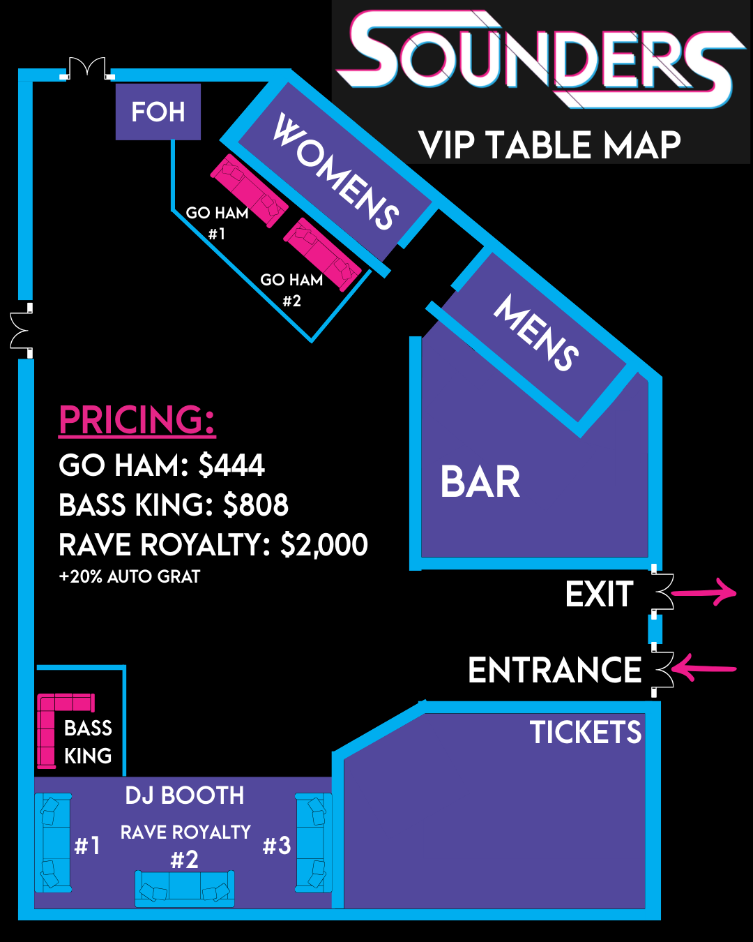 Close to the entrance and exclusively reserved for you, this perk ensures a smooth start and end to your night, making every moment at Sounders as effortless as it is exhilarating.
